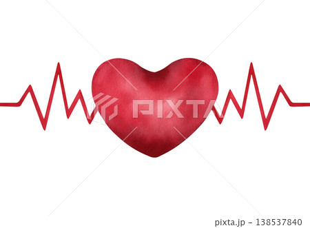 Watercolor illustration of red heart with electrocardiogram pulse line. Heartbeat rhythm. Cardiology concept for healthcare, medicine, blood pressure, charity. Hand painted isolated from background