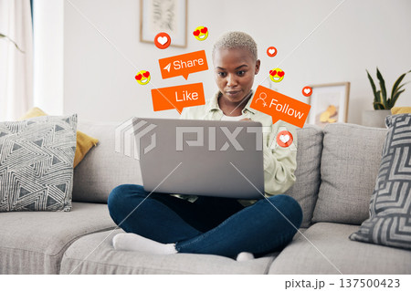 Emoji, overlay and black woman with laptop on a sofa for social media, chat or notification at home. Emoticon, reaction and African lady influencer online for blog, update or podcast content creation