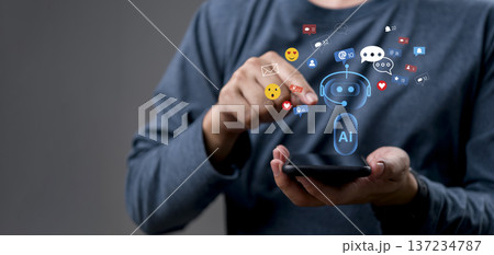 AI chatbot technology social media marketing. Hand holding smartphone, customer service automation. Digital engagement, notification, comment, like. Communication, CRM concept.
