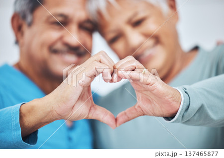 Couple, senior and heart hands in home, love and bonding in retirement together. Romance, hand gesture and elderly man and woman with emoji for care, affection and empathy, commitment and trust.