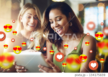 Happy, online dating icon or friends with tablet for communication or social media texting together. Smile, girls or excited friends on fun website or digital network with love, like or heart emoji