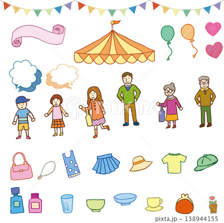 お出かけする家族とフリーマーケット素材のカラフルな手書きイラストセット