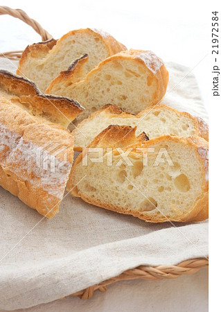 フランスパンのスライス|自然光と白い背景でシンプルに