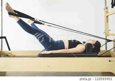 マシンを使ってピラティスをする若い女性