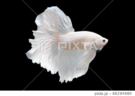 Betta White Plattinum Halfmoon HM Male or Plakat Fighting Fish Splendens on Black Background.