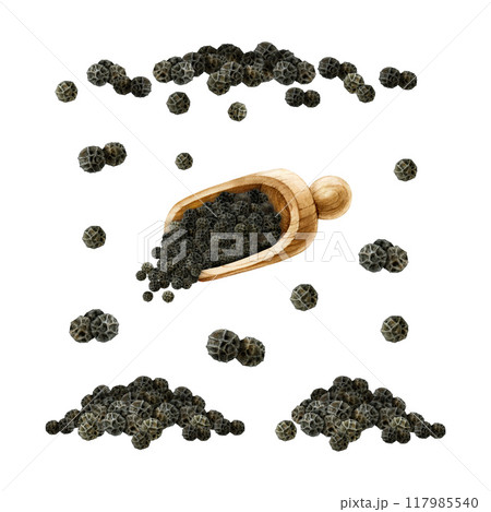 Black peppercorn spice painted illustration set. Hand drawn black pepper spice condiment heap, single elements for cooking and seasoning. Isolated on white background
