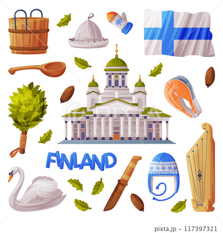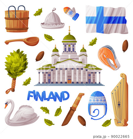Finland Symbol and Attribute with Saint Nicholas Cathedral and Bath Broom Vector Set