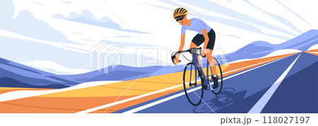 Cyclist riding on open road with mountains in the background wearing helmet and sunglasses bright colors dynamic sky