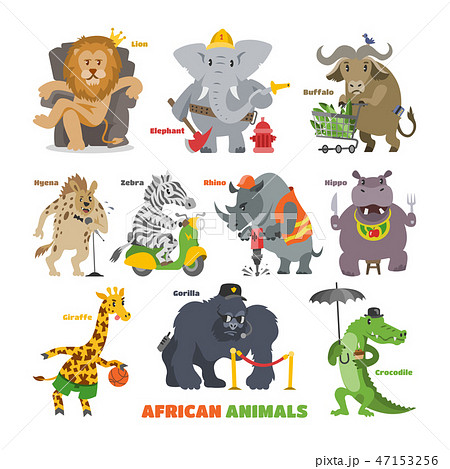 African animals vector cartoon wild animalistic characters lion king elephant fireman security
