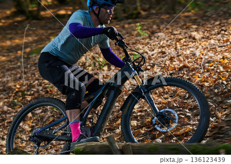 Mountain Biker Navigating Forest Trail On Offroad Terrain During Autumn Leaves And Gear