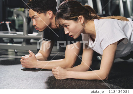 トレーニングジムで真剣な表情で腹筋をするストイックな若い男性
