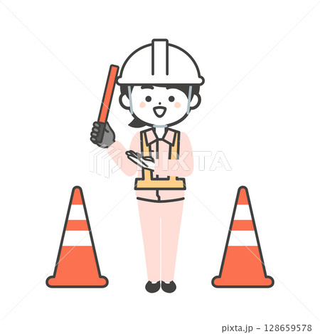 誘導棒を持つ作業服を着てヘルメットをかぶった3頭身女性のイラスト