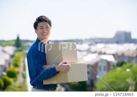 車の前で段ボール箱を台車で運ぶ作業服姿の男性