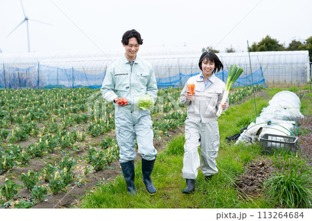 ビニールハウスで収穫したイチゴを持つ若い女性