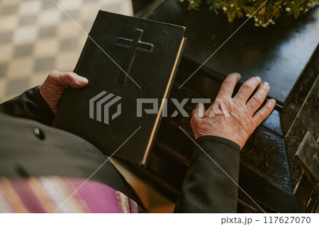 Unrecognizable priests wrinkled hand holding holy book and touching black coffin in church