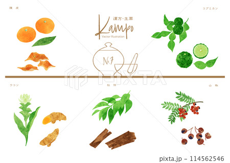 生薬ベクターイラストセット7(陳皮・コブミカン・ウコン・杜仲・山椒)