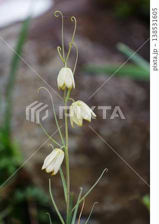春の植物、葉がくるくるに巻いている個性的なバイモユリの花の水彩画イラスト