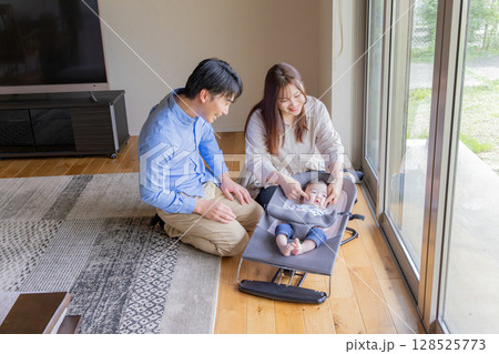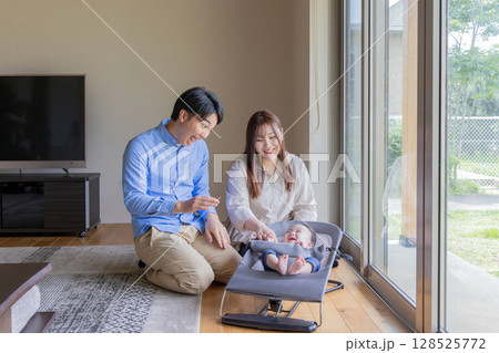 部屋で赤ちゃんをあやすカップル