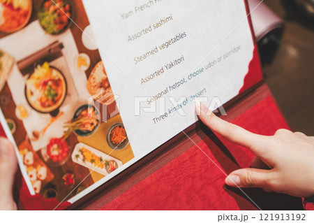 メニューを見て選ぶ女性客の手【撮影協力・海鮮居酒屋 魚魯こ】