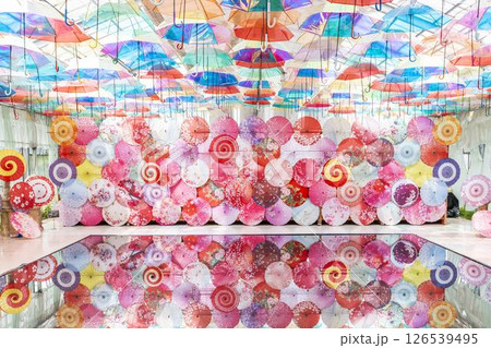 ハーブ園のカラフルな「アンブレラスカイ」 福島県猪苗代町