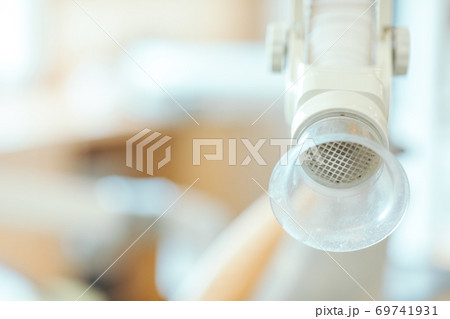 寒色、水色の一般的な歯医者さんの診察台・チェア、歯科診療ユニット、機材フルセット
