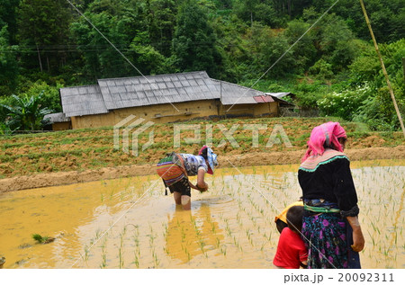 ベトナム北部 バクハ 田植えをする花モン族の家族