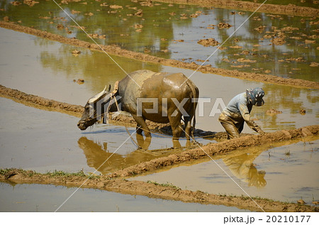 ベトナム北部 バクハ 水田を耕す水牛とベトナム人