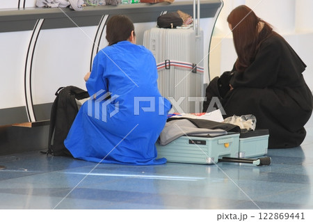羽田空港で出発を待つ搭乗客 スーツケースに足を置いて搭乗時間を待つ乗客