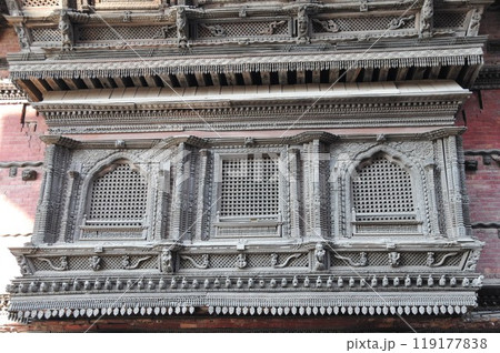 ネパール、カトマンズ、バサンタプル広場、ハヌマンドカ(旧王宮)の窓、ネワール彫刻