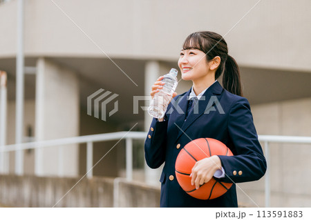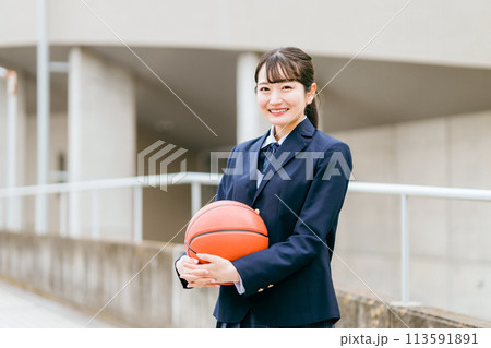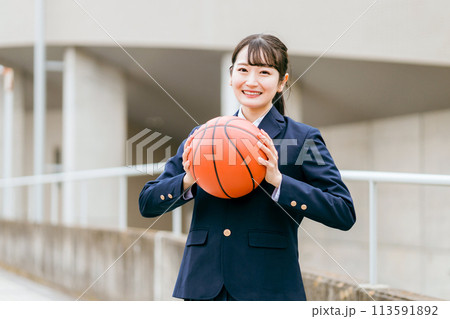 校舎の前でバスケットボールを持つ女子中学生・女子高生(部活・スポーツ・運動部・バスケ部)