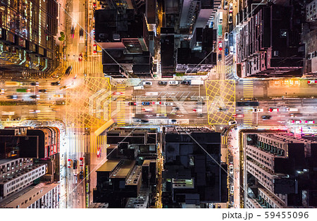 Car, taxi, and bus traffic on road intersection at night in Hong Kong downtown district, drone aerial top view. Street commuter, Asia city life, or public transportation concept