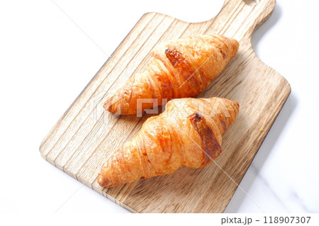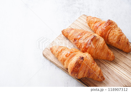 焼き立てのクロワッサンがカッティングボードにのせられた、朝の風景のイメージ
