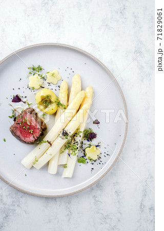 dry aged sliced fillet steak with white asparagus and roast potatoes