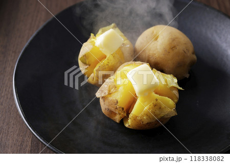 じゃがバター、湯気を上げるジャガイモ、溶けるバター