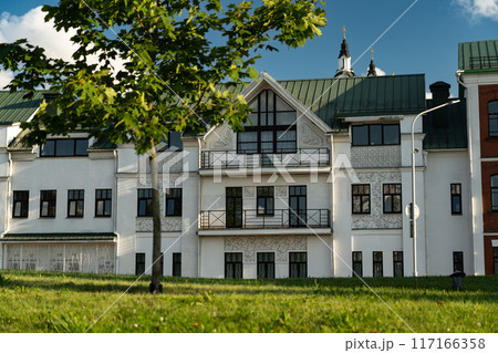 White, old house with a green roof, green field, green tree