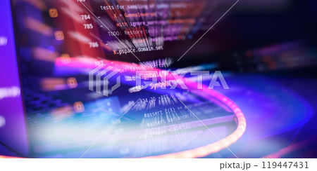 Abstract technological illustration with neon lights on a dark blue gradient background. This vector was hand drawn.