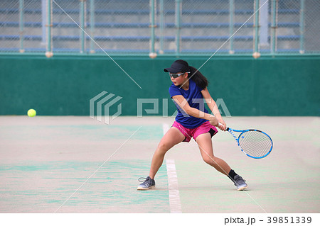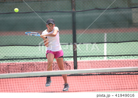 バックハンドを打つ女子ジュニアテニスプレイヤー