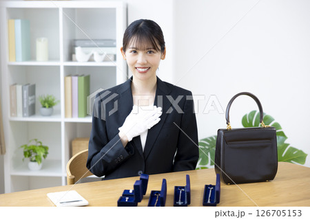 買取業者 バックと貴金属の査定をしてもらっている女性