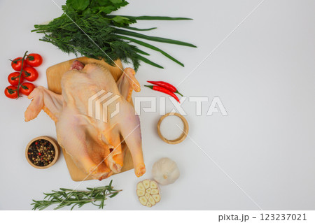 A raw processed chicken carcass lies on a wooden board with spices in wooden bowls, herbs, herbs and vegetables with space for text on a white background. The concept of cooking, wholesome and healthy