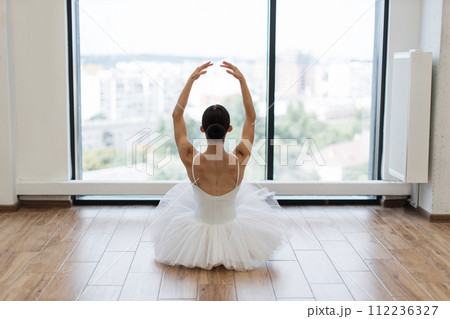 Focused young ballerina dressed in white tutu costume practice ballet poses.