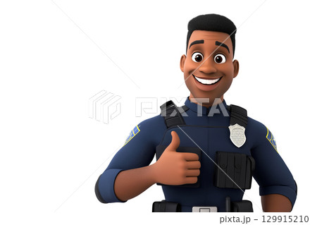 Friendly African policeman gesturing thumbs up, showing approval and support. Funny cartoon character in 3d style design