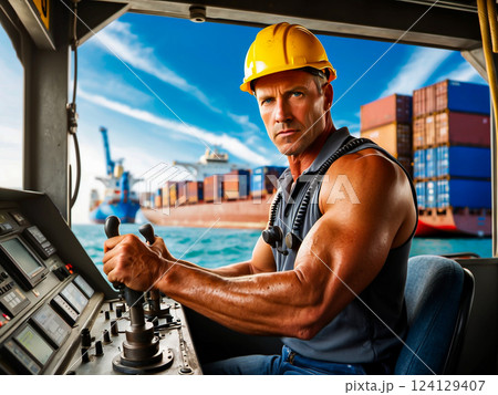 Male worker sitting at the control panel and holding the control gear to operate the crane in the sea port.