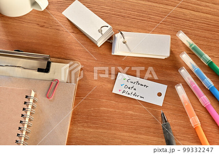 Customer Data Platformと書かれた単語帳のあるデスク