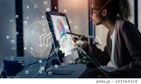 オフィスでPCを使う女性とネットワークイメージ