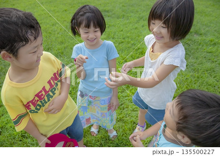 公園で捕まえたバッタを見る子供たち