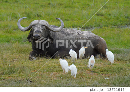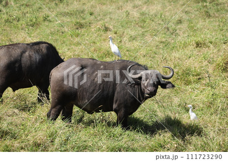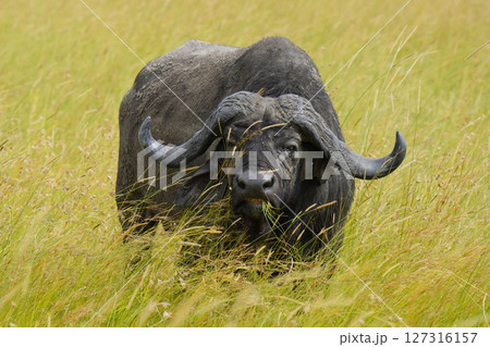 ケニア・マサイマラの草原でたたずむバッファロー Buffalo, Masai Mara Kenya
