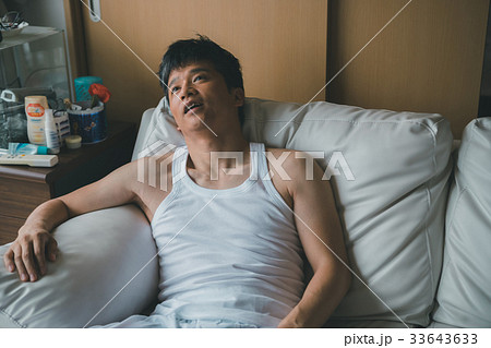 口を開けて目を閉じ座り込んでいる男性主線なし