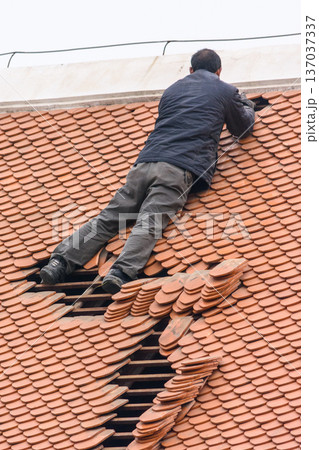 Roofer repairing terracotta tile roof on residential house