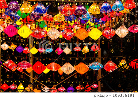 colorful glowing Chinese lanterns in park in night