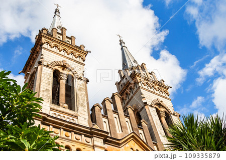 bottom view of towers Batumi Cathedral in autumn